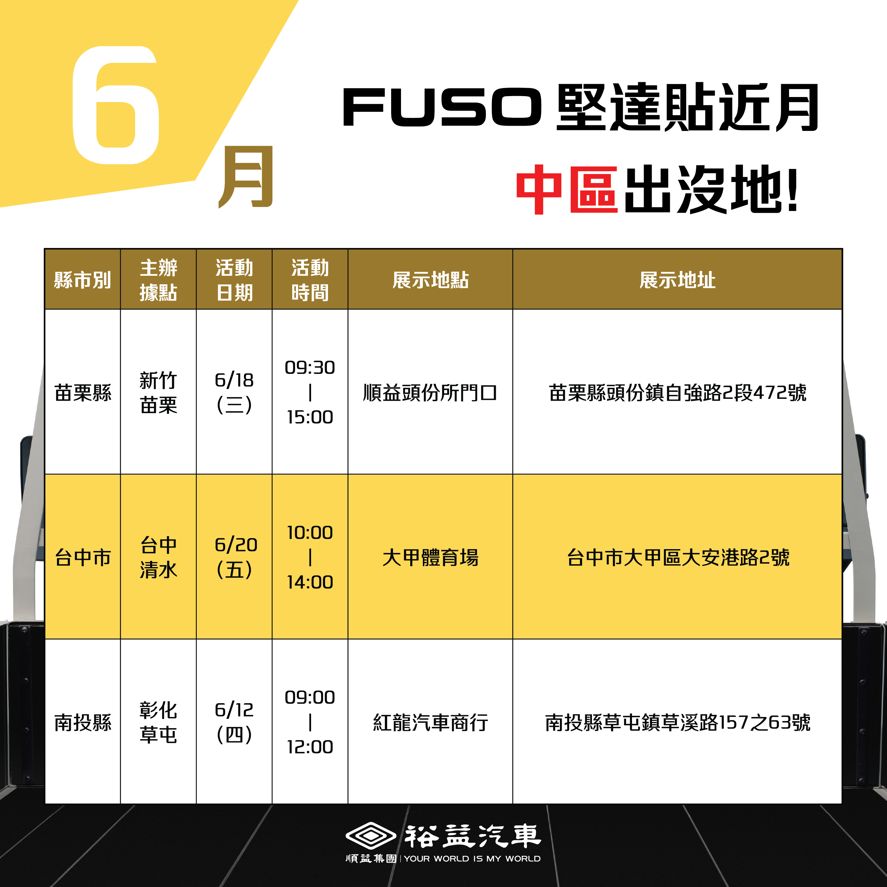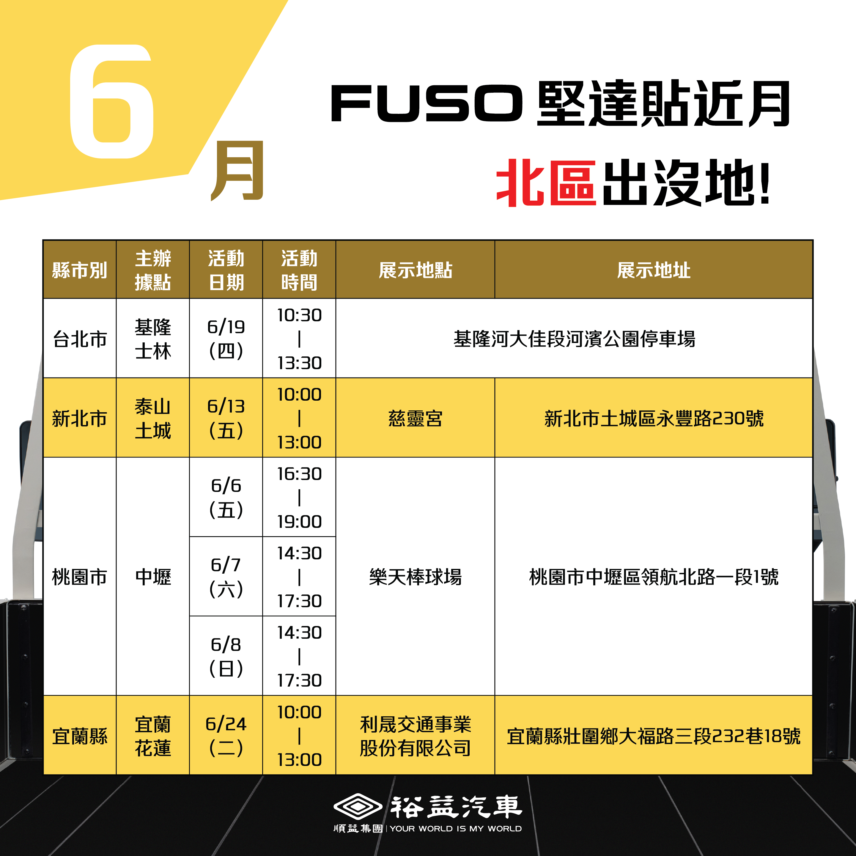 裕益汽車保留變更、取消活動內容及辦法的權利,並保有最終解釋權。場次表僅供參考,實際活動將以裕益汽車官網公告為主,或致電主辦據點洽詢。