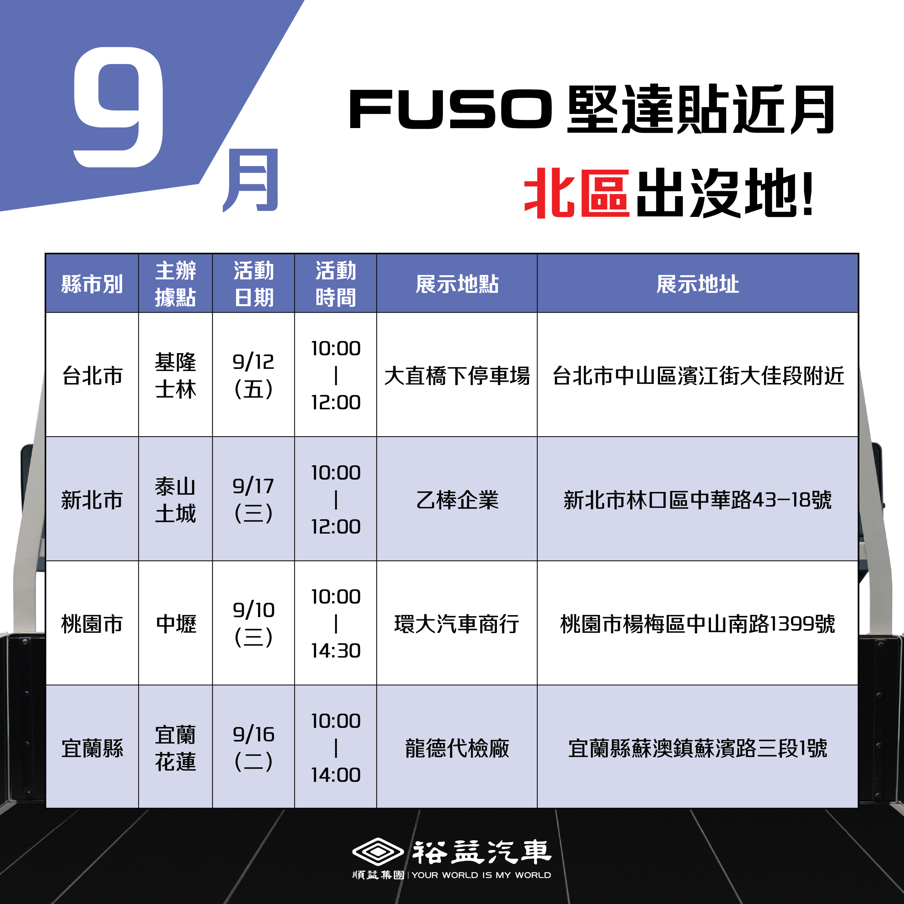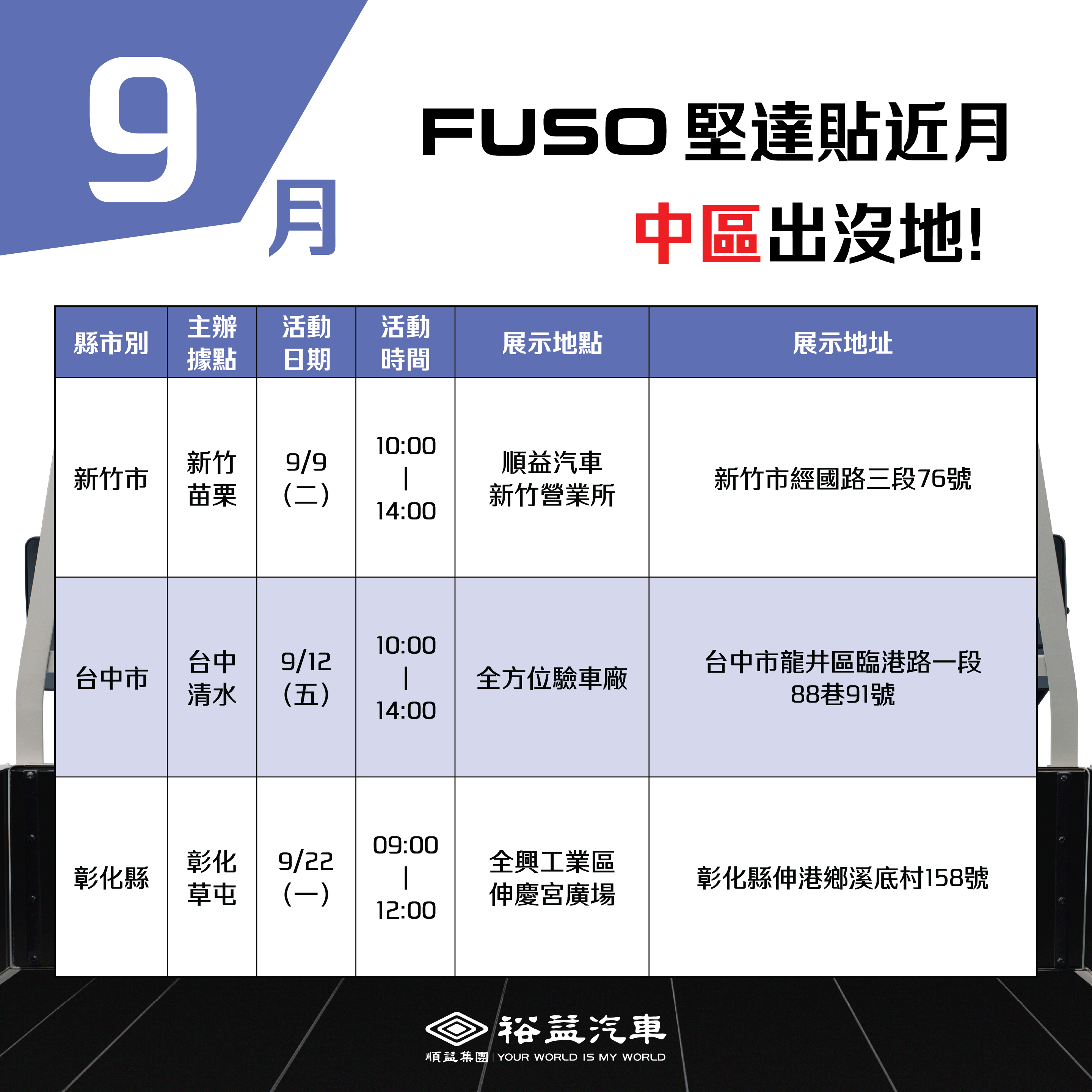 CANTER 全新升級・科技再進化 更好開、更有力、更舒適,內裝大器再進化, 帶來頭家們最強大的事業夥伴! FUSO始終在你身邊 遍布全台,實車展示,邀請您親臨現場, 近距離感受CANTER的升級魅力! 各場次資訊請見下方表格: 裕益汽車保留變更、取消活動內容及辦法的權利,並保有最終解釋權。場次表僅供參考,實際活動將以裕益汽車官網公告為主,或致電主辦據點洽詢。