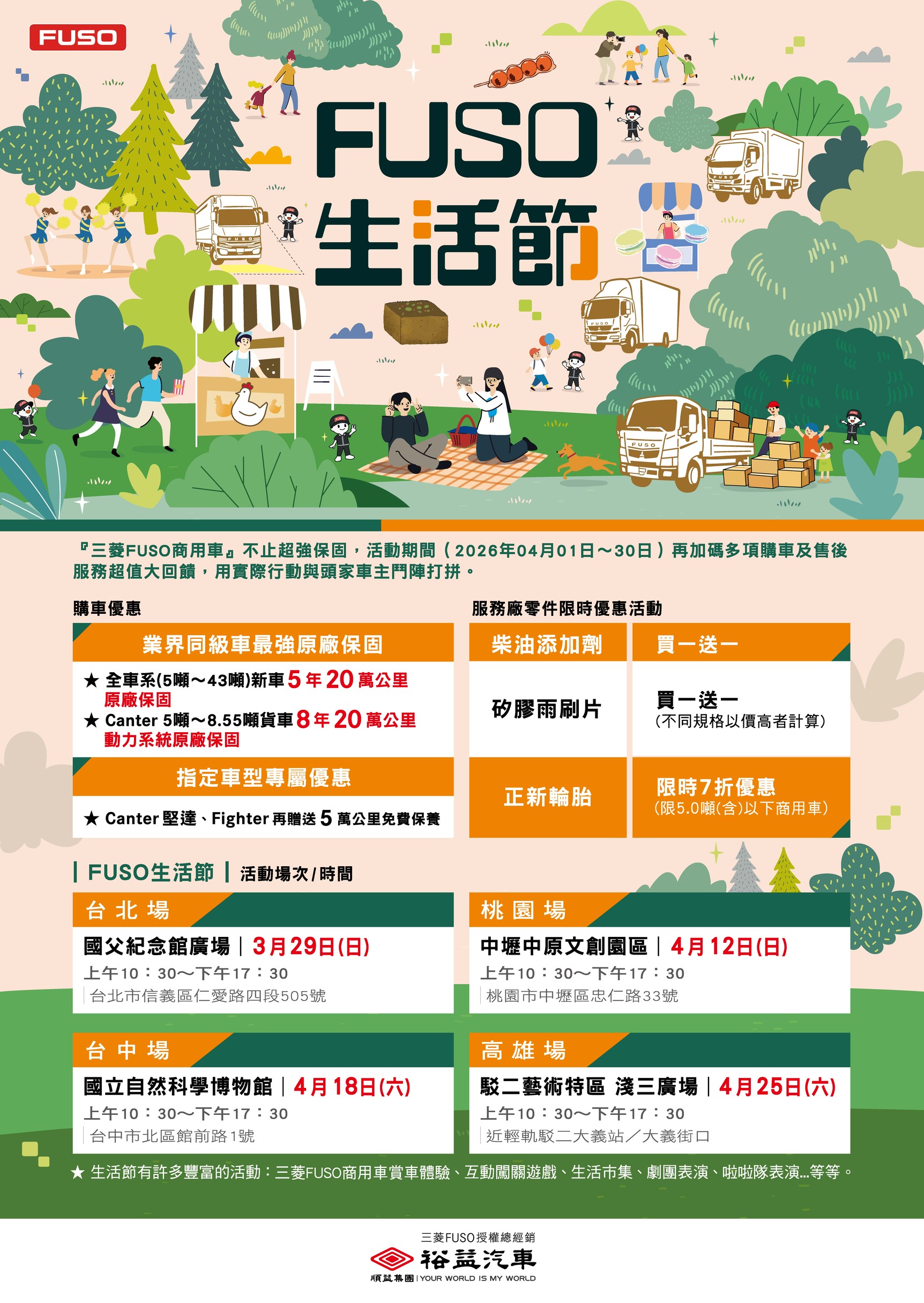 配合FUSO生活節,我們準備了一系列【新車購車優惠】與【服務保養優惠】,